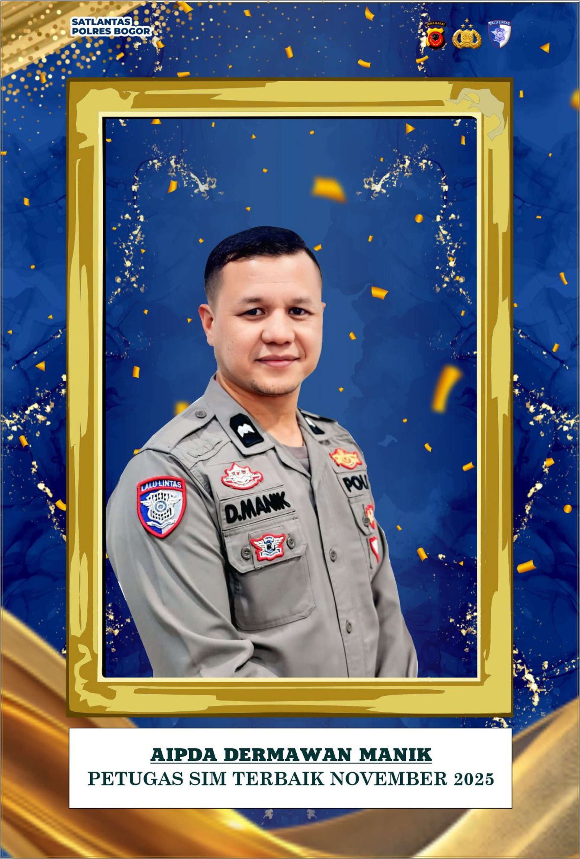 Anggota Satpas Polres Bogor yang telah menunjukan dedikasi terbaik dalam melaksanakan tugas sebagai petugas layanan penerbitan SIM pada kelompok kerja Identifikasi. Yang bersangkutan menunjukan sikap disiplin, tepat waktu, dan tidak pernah menerima komplain dari pengguna layanan sehingga Satpas Polres Bogor memberikan apresiasi menjadi petugas layanan terbaik periode tahun 2024.
